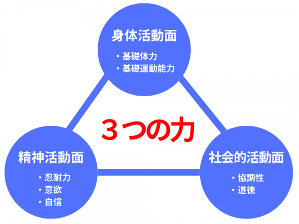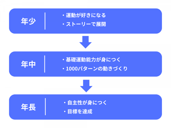 カリキュラム構成の大きなねらいとして「身体活動面=からだ」「精神活動面=こころ」「社会的活動面=集団」の3つの力に焦点を当て、社会で活躍できる力を育てていきます。また、年齢ごとのねらいとして、3年計画を立てた上で段階的な指導を行います。子ども達は楽しく、自然体で様々な種目を成就できるようになります。