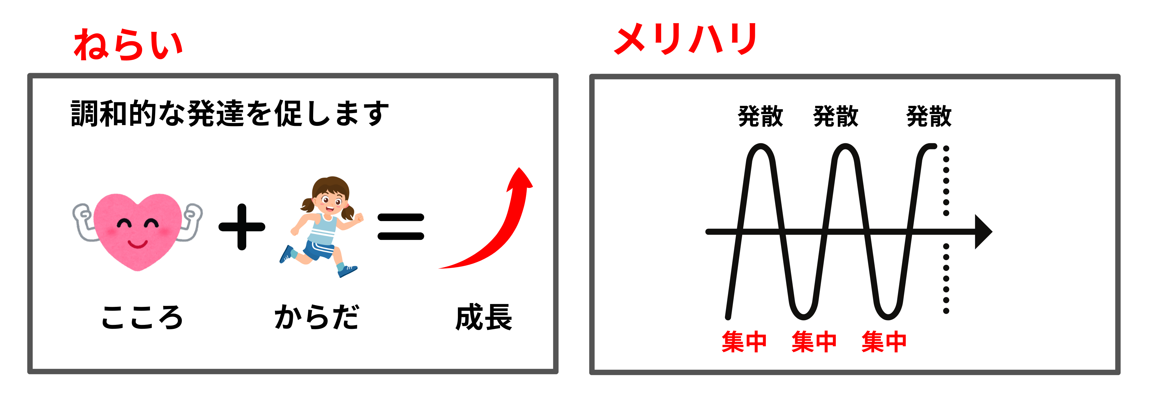 こころとからだが共に成長していく為に、カリキュラムの内容を集中→発散→→集中→発散を繰り返す流れにしています。